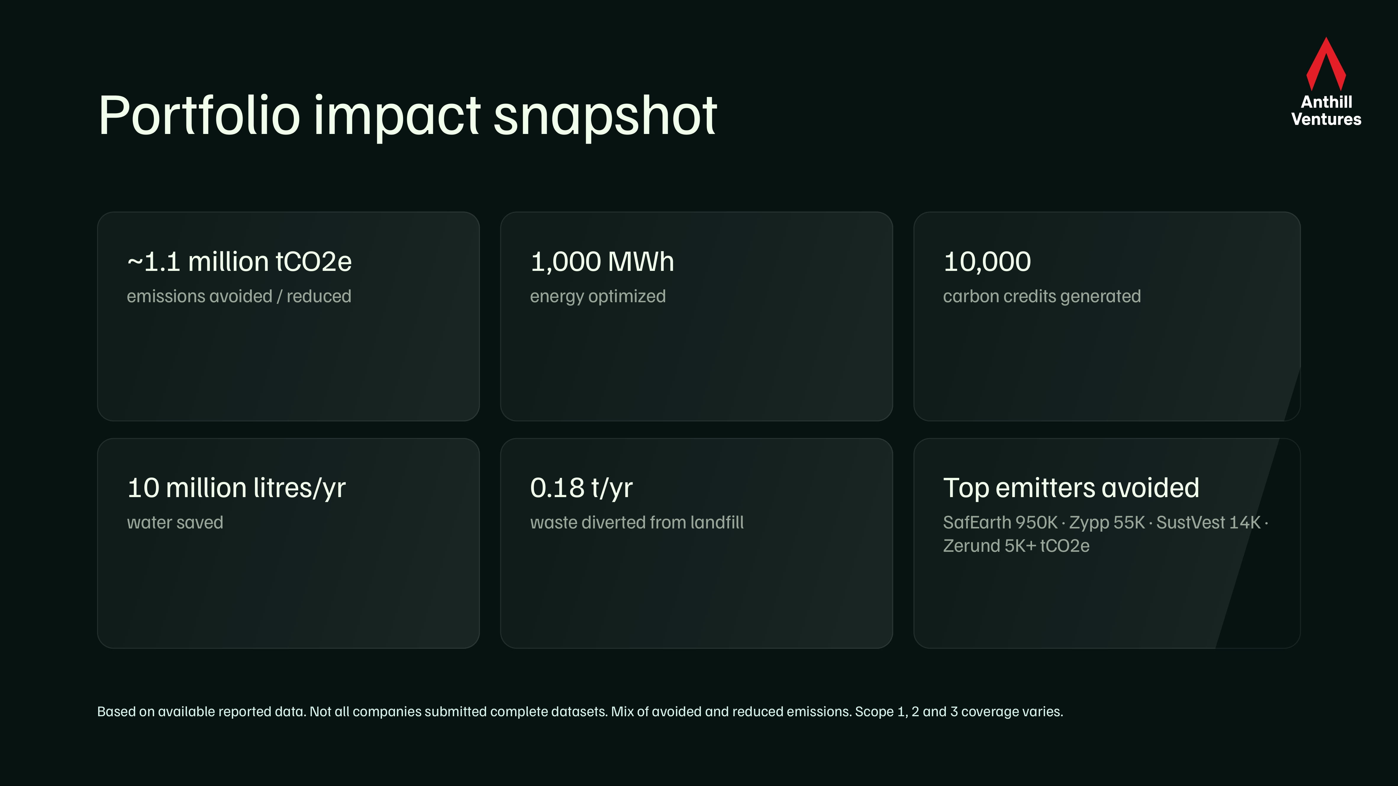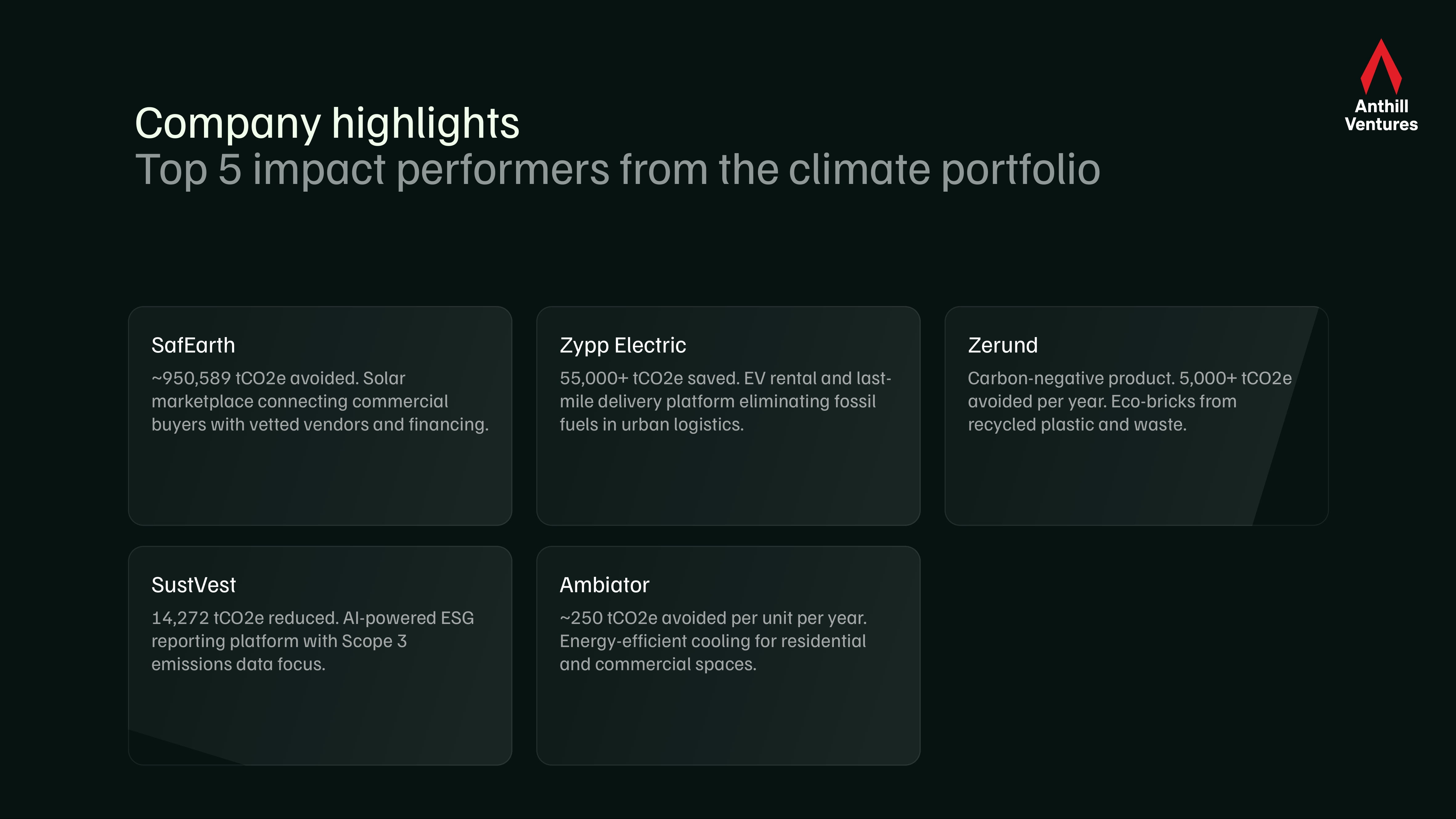 India's climate economy is no longer a thesis — it's a portfolio. Anthill's first Climate Impact Report maps the real-world outcomes across 17 companies tackling energy, mobility, water, materials, and ESG — with over 1.1 million tCO2e avoided, 10 million litres of water saved annually, and four signals shaping where the next bets go.